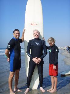 Ted also did some traveling in the fall. He was able to accompany his parents to Ben Allen's Navy squadron reunion in Baltimore, joined by his other siblings. November found him in Los Angeles for a business conference. Afterwards, he visited his brother, Stephen, who took him surfing. We have this photo to prove that he at least got into a wet suit... (with his brother and nephew Riley)